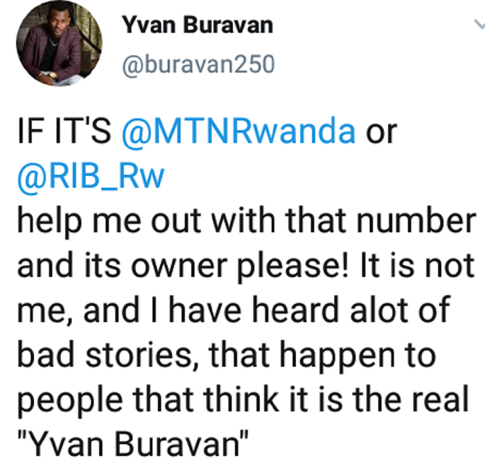 Akoresheje urukuta rwe rwa Twitter, umuhanzi Yvan Buravan tariki ya 25 Gashyantare 2020 nibwo yanditse asaba RIB na MTN ubufasha bwo gukurikirana abantu bari bamwiyitiriye ku mbuga nkoranyambaga za Facebook bagasaba abantu amafanga bakoresheje izina rye aho bari banatanze nimero ya telephone abantu boherezaho amafaranga.