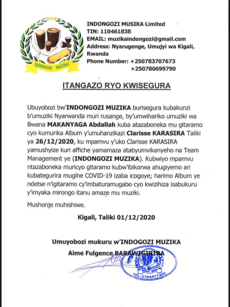 Itangazo ryashyizwe hanze na INDONGOZI MUZIKA, rivuga ko “Bisegura ku bakunzi b’umuziki nyarwanda muri rusange by’umwihariko umuziki wa Makanyaga Abdallah kuba atazaboneka mu gitaramo cyo kumurika album y’umuhanzikazi Clarisse Karasira.”