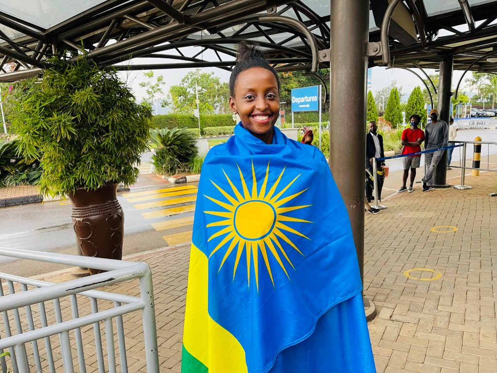 Ku kibuga cy’indege, Miss Ingabire Grace yagaragaye yambaye ibendera ry’u Rwanda aho yanasabwe kugenda yumva ko ahagarariye Abanyarwanda bose