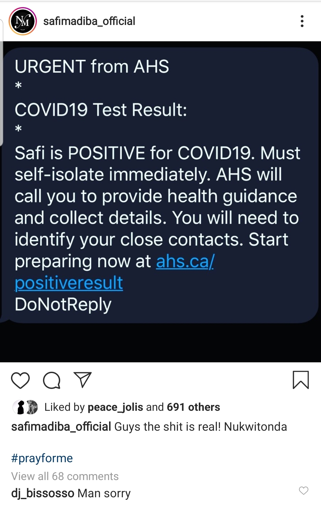 Umuhanzi Niyibikora Safi wiyita Madiba yatangaje ko yamaze kwandura icyorezo cya COVID19 giterwa n’agakoko gashya ka Coronavirus.