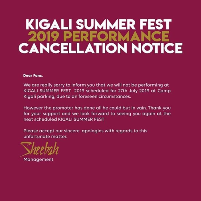 Ibaruwa yashyizwe ahagaragara n’abashinzwe kureberera inyungu z’uyu muhanzi ishimangira ko ku mpamvu zitatangajwe ‘ababajwe no kumenyesha abakunzi be ko atakitabiriye Kigali Summer Fest’