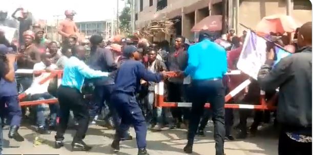 Mu mashusho y’iyi myigaragambyo akomeje gusaka ku mbuga nkoranyambaga , abigaragambya ubona ko barubiye, barwanira gufungura umupaka na Polisi nayo igerarageza kongera kuwufunga.