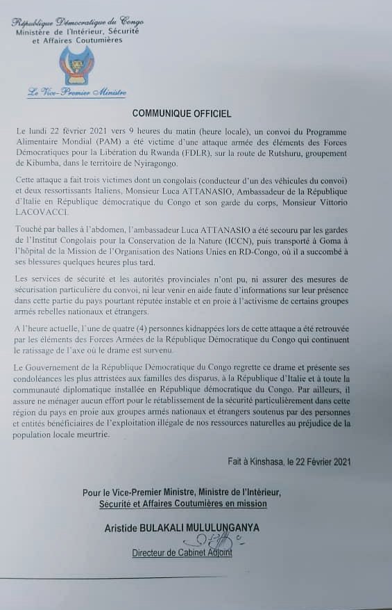 Minisiteri y’Umutekano muri Repubulika Iharanira Demokarasi ya Congo yatangaje ko umutwe wa FDLR ari wo wishe Ambasaderi Luca Attanasio wari uhagarariye u Butaliyani muri kiriya gihugu.