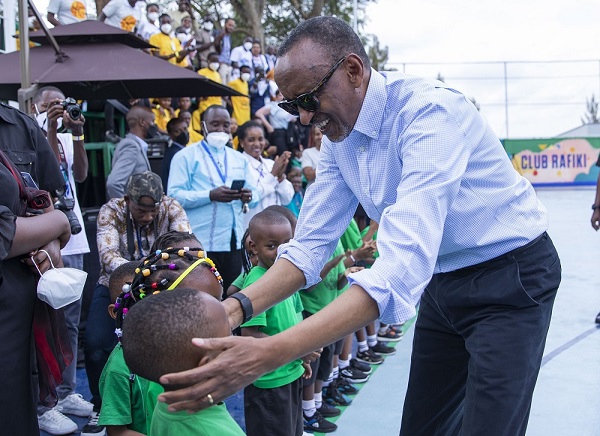 Ifoto ya Perezida wa Repubulika y’u Rwanda, Paul Kagame, asuhuza abana bari bitabiriye igikorwa cyo gutaha Ikibuga cya Club Rafiki cyavuguruwe, yazamuye amarangamutima ya benshi.