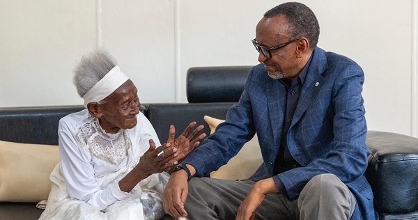 Perezida wa Repubulika Paul Kagame yasuye umukecuru Rachel Nyiramandwa w’imyaka 110 utuye mu Kagari ka Ngiryi mu Murenge wa Gasaka mu Karere ka Nyamagabe, baraganira.