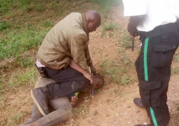 Uyu watawe muri yombi, yagaragaye mu ifoto yashyizwe kuri Twitter n’utwa Izibyose, igaragaza umuntu wambaye ikote afite n’icyombo ari kuniga umuturage akoresheje inkoni zitwazwa n’abacunga umutekano bigenga bazwi nk’abasekirite.