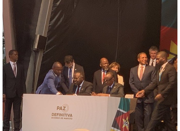 Aya masezerano yashyizweho umukono na Perezida wa Mozambique n’ umuyobozi w’ ishyaka rikomeye ritavugarumwe n’ ubutegetsi yitezweho guhagarika intambara yo gusubiranamo kw’ abaturage imaze imyaka irenga 15 ikaba bimaze kugwamo abarenga miliyoni.