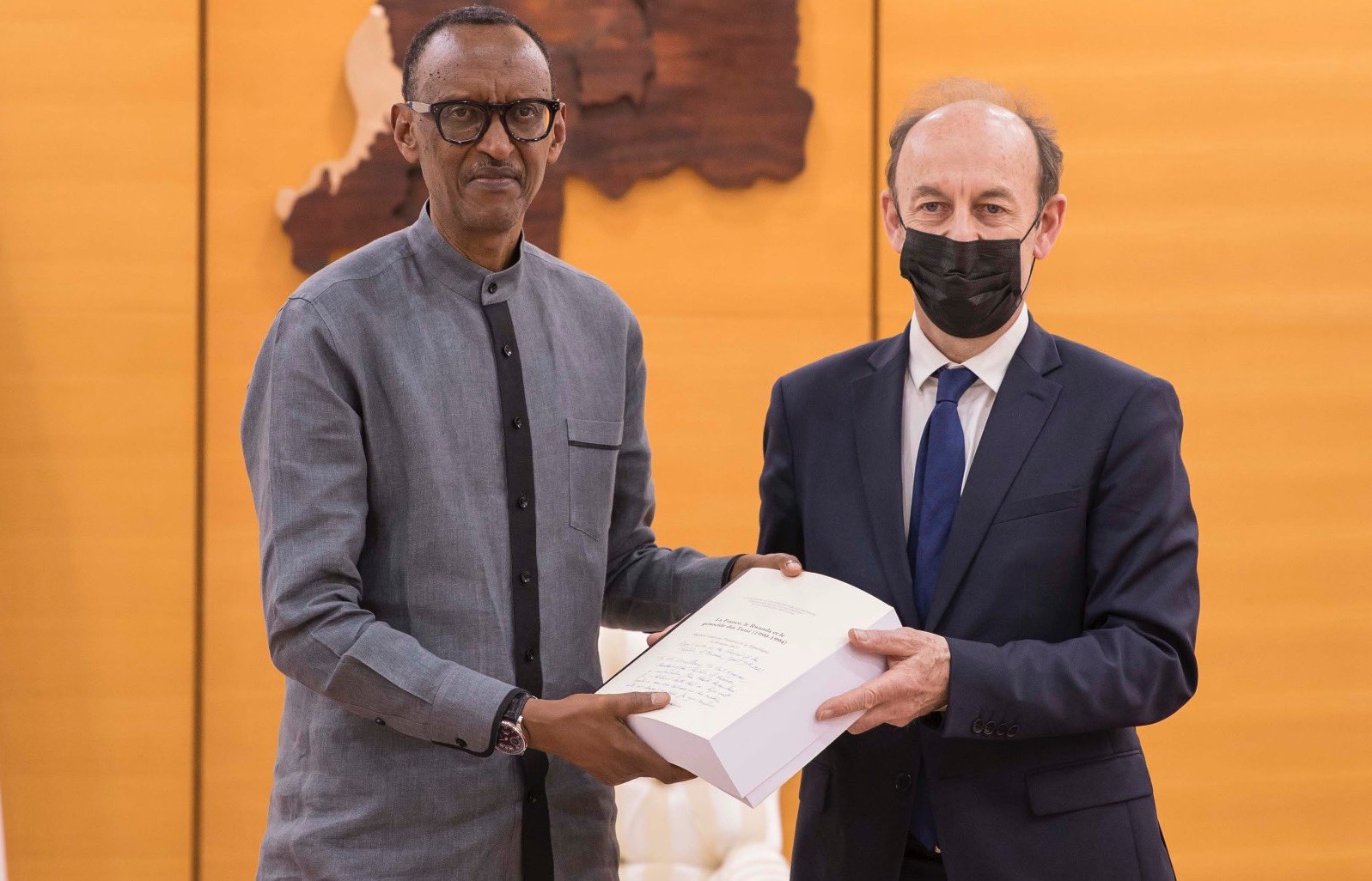 Vincent Duclert yashyikirije Perezida Kagame iyi raporo kuri uyu wa Gatanu nyuma y’uko yari amaze iminsi ari mu Rwanda.