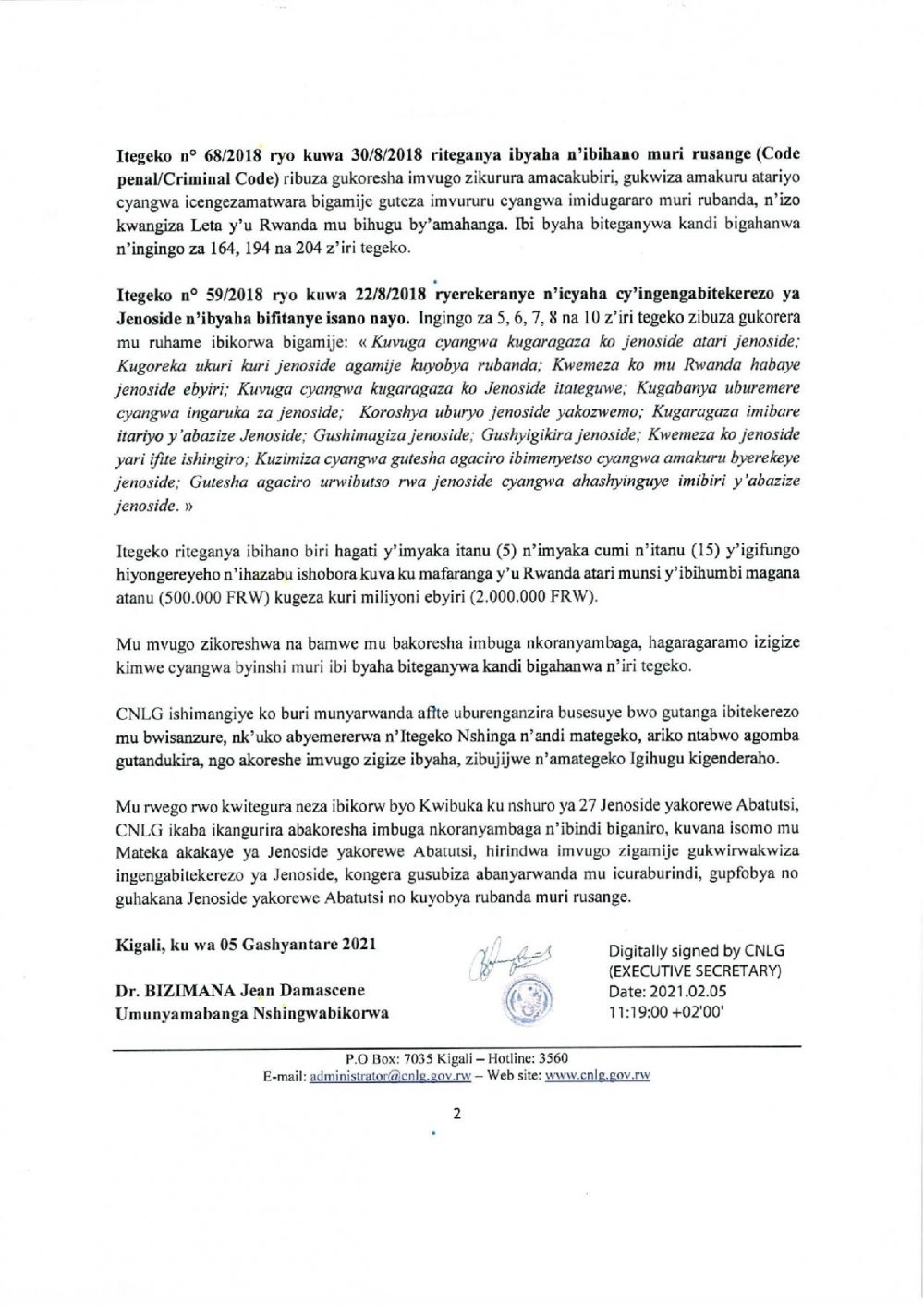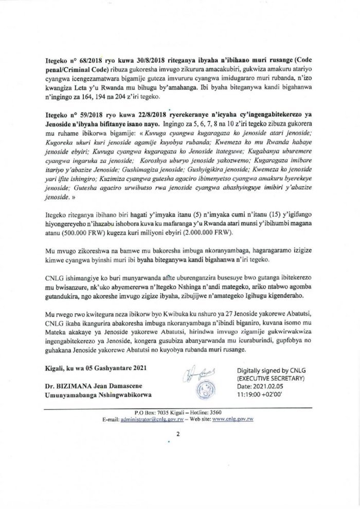 CNLG yibukije ko myitwarire nk’iyi ibujijwe mu Rwanda kandi kandi ihanwa n’amategeko anyuranye arimo Itegeko Nshinga ndetse n’itegeko riteganya ibyaha n’ibihano.
