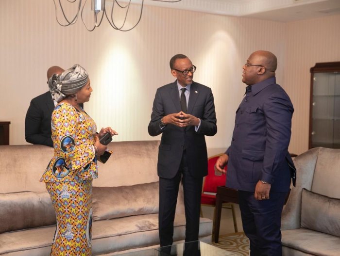 Perezida w’ u Rwanda Paul Kagame na Perezida wa Angola bombi bakiriwe na Perezida wa Repubulika ya Demukarasi ya Kongo Felix Antone Tshisekedi bagirana ibiganiro bigamije inyungu kuri ibi bihugu bitatu.