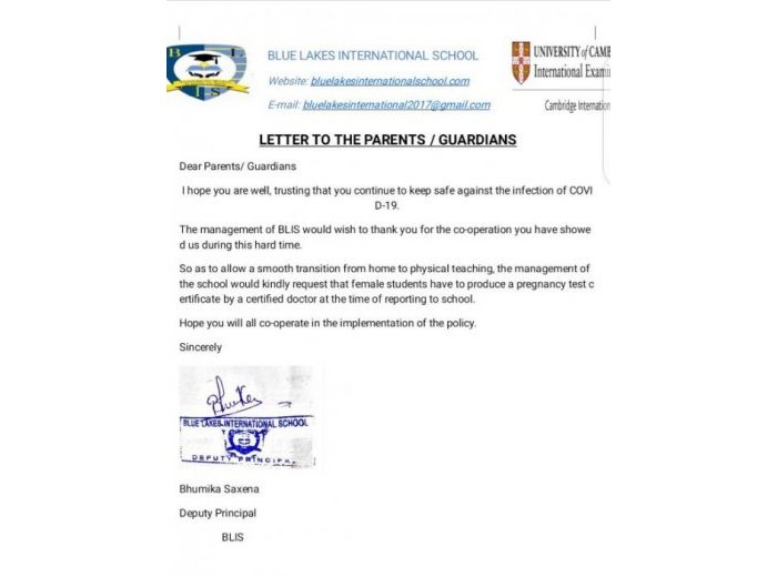 Gusa yakomeje ati "Ubuyobozi bw’ishuri burasaba abanyeshuri b’abakobwa kugaragaza icyemezo cy’uko badatwite cyatanzwe n’umuganga wemewe mu gihe bazaba bagaruka ku ishuri."