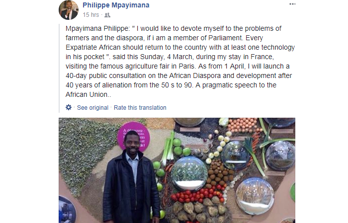 Mpayimana Philippe uri mu gihugu cy’Ubufaransa ari naho atuye we n’umuryango we, kuri iki Cyumweru tariki 4 Werurwe 2018 aho yavuze ko yifuza kuba umudepite mu Nteko Ishinga Amategeko y’u Rwanda, abinyujije ku rukuta rwe rwa Facebook.