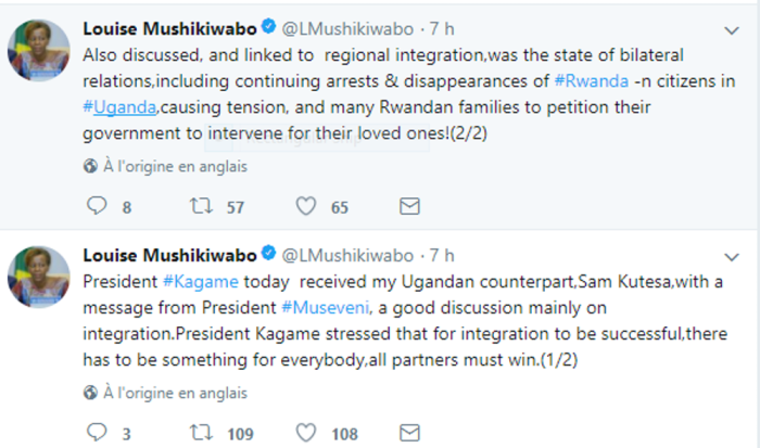 Minisitiri Mushikiwabo kandi yavuze ko ibiganiro byabaye hagati ya Perezida Kagame na Minisitiri Kutesa byagarutse ku bibazo rusange biri mu karere ka Afurika y’Uburasirazuba mu rwego rwo gukomeza umubano haba hagati y’u Rwanda na Uganda ndetse no hagati y’ibindi bihugu bigize Umuryango wa Afurika y’Uburasirazuba