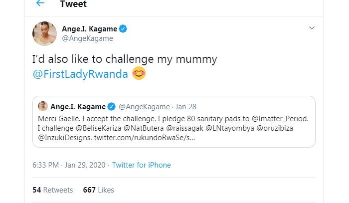 Umunyamabanga wa Leta muri Minisiteri y’ububanyi n’amahanga ushinzwe ubutwererane muri Afurika y’Iburasiraba Olivier Nduhungirehe, umugore wa Perezida Kagame ,Jeannette Kagame n’umukobwa we Ange Ingabire Kagame binjiye mu bukangurambaga bwo gushakira abangavu impapuro z’isuku bakenera bari mu mihango.
