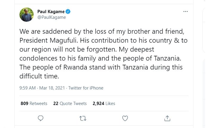 Mu butumwa yanyujije kuri Twitter ye, Perezida Paul Kagame yavuze ko ababajwe n’urupfu “rw’umuvandiwe akaba n’inshuti, Perezida Magufuli.”