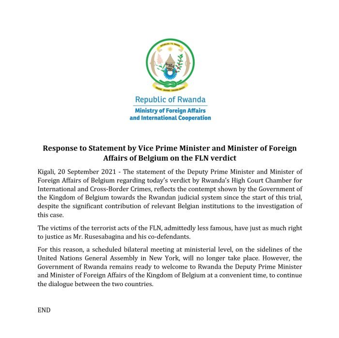 Nyuma y’ibi byatangajwe na Guverinoma y’u Bubiliri, Guverinoma y’u Rwanda na yo yahise isohora itangazo rivuga ko kuva mu itangira rya ruriya rubanza, u Bubiligi bwakomeje kunenga imikorere y’ubutabera bw’u Rwanda kabone nubwo inzego z’iperereza za kiriya gihugu zatanze umusanzu ukomeye muri kiriya kirego.