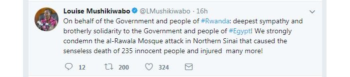 Abinyujije ku rukuta rwe rwa Twitter, Minisitiri Louise Mushikiwabo yihanganishije imiryango y’abaguye muri icyo gitero n’abaturage ba Misiri muri rusange avuga ko u Rwanda rwifatanyije na bo mu kababaro.