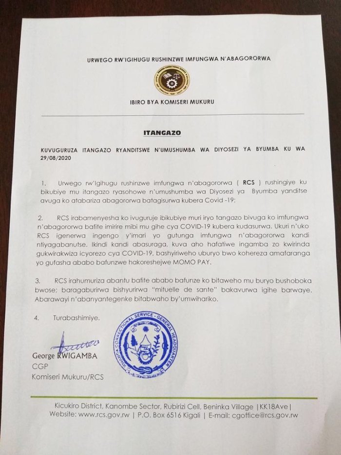 Nyuma y’uko iyi baruwa igiye hanze ikanakwirakwizwa ku mbuga nkoranyambaga, Urwego rw’amagereza mu Rwanda RCS, rwahise rubyamagana ruvuga ko rugenerwa ingengo y’imari yo gutunga imfungwa n’abagororwa kandi ikaba itaragabanutse, ikindi ngo guhagarika gusura ntibyabujije ko abafite ababo bafunzwe baboherereza amafaranga kuri Mobile Money. Mu itangazo ryashyizweho umukono n’umuyobozi mukuru w’uru rwego, CG Rwigamba George, yavuze ko abagororwa bitaweho uko bikwiye, ko bavuzwa kandi abafite uburwayi bakitabwaho by’umwihariko.