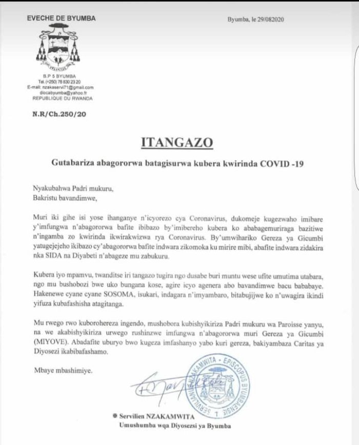 Muri iyi baruwa, Musenyeri Nzakamwita ati : "Muri iki gihe isi yose ihanganye n’icyorezo cya Coronavirus, dukomeje kugezwaho imibare y’imfungwa n’abagororwa bafite ikibazo cy’imibereho kubera ko ababagemuriraga bazitiwe n’ingamba zo kwirinda ikwirakwizwa rya Coronavirus. By’umwihariko gereza ya Gicumbi yatugejejeho ikibazo cy’abagororwa bafite indwara zikomoka ku mirire mibi, abafite indwara zidakira nka SIDA na diyabeti n’abageze mu za bukuru."