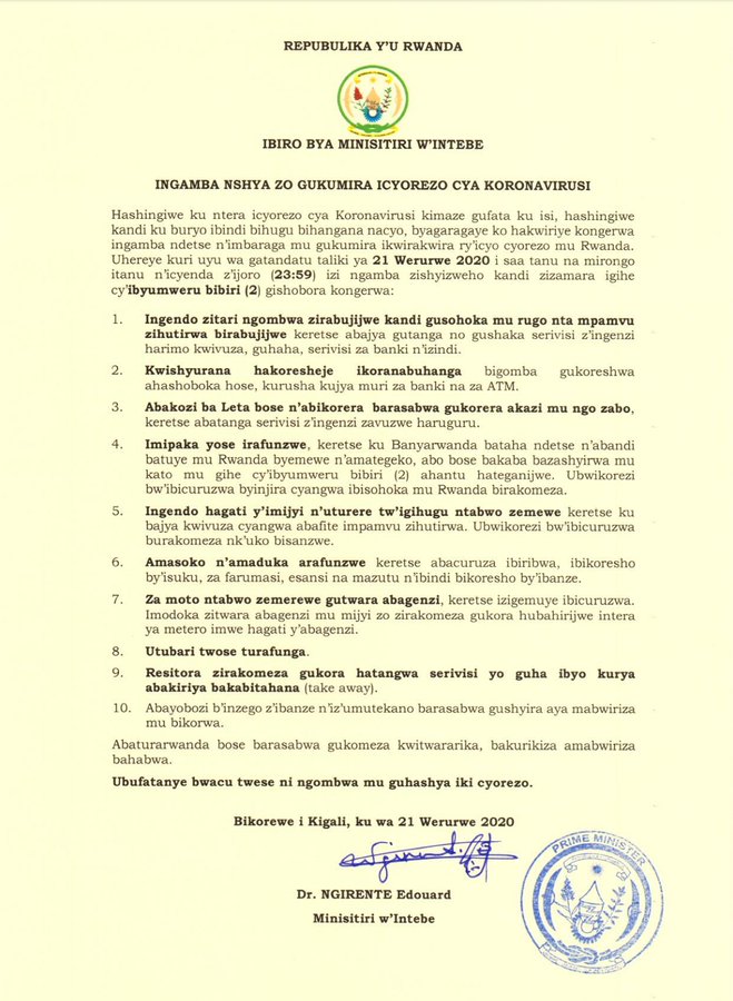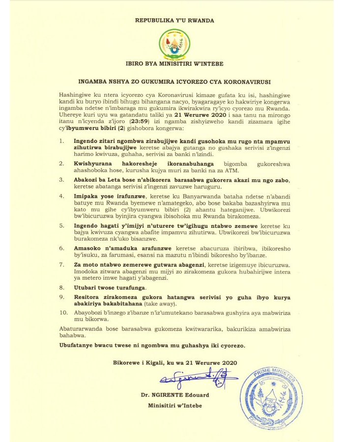 Iri tangazo ryashyizweho umukono na Minisitiri w’ Intebe Dr Edouard Ngirente