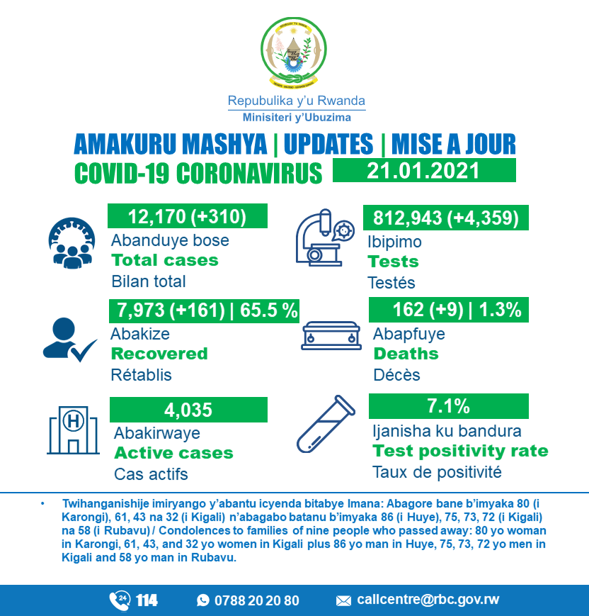 Kuri uyu wa Kane tariki 21 Mutarama 2021, COVID-19 yishe abantu icyenda (9) akaba ari na bo benshi ihitanye mu masaha 24 kuva yagera mu Rwanda mu gihe abamaze guhitanwa n’iki cyorezo bose ari 162.