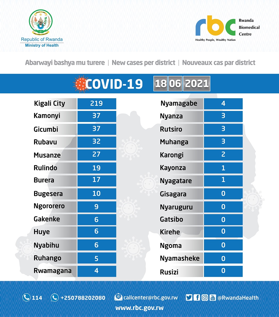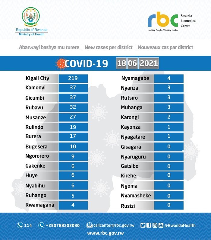 Muri aba bashya basanganywe COVID-19, barimo 219 bo mu Mujyi wa Kigali mu gihe Uturere na Kamonyi na Gicumbi twagaragayemo abantu 37 (buri Karere) naho Akarere ka Rubavu kamaze iminsi kanugarijwe ko kakaba kabonetsemo abarwayi bashya 32.