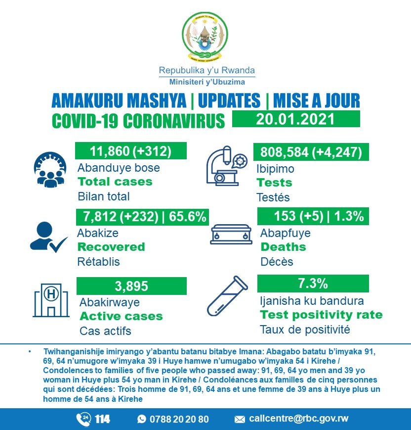 Kuri uyu wa Gatatu tariki 20 Mutarama 2021 mu Rwanda habonetse abarwayi bashya 312 akaba ari na wo mubare munini ubonetse kuva iki cyorezo cyagera mu Rwanda.