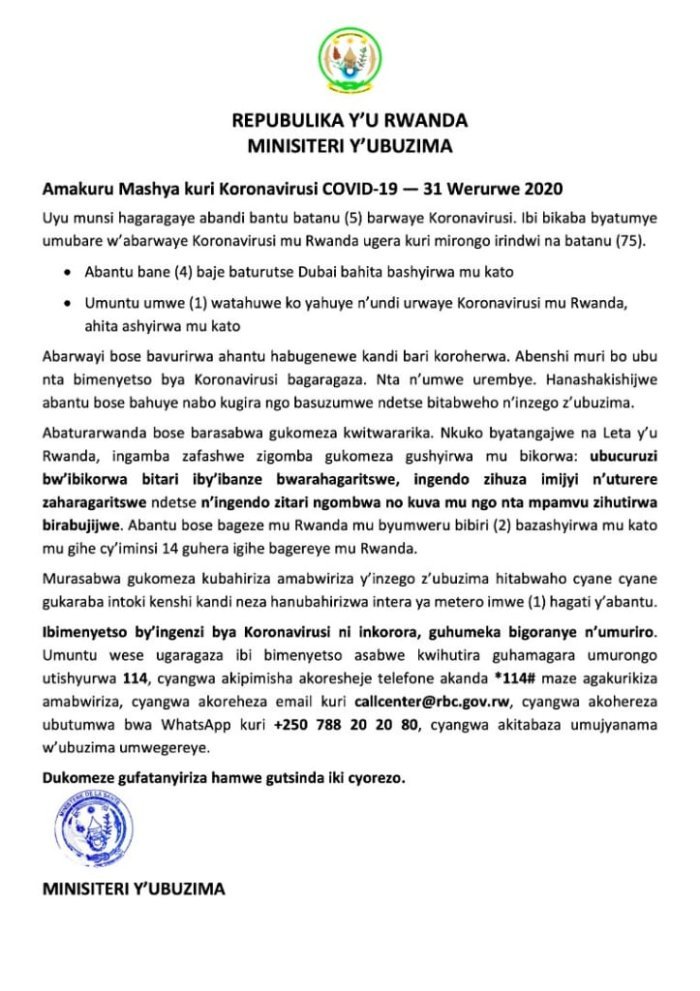 Minisiteri y’ubuzima yatangaje ko kuri uyu wa 31 Werurwe 2020 habonetse abarwayi 5 bashya banduye coronavirus bituma abarwayi bose hamwe baba 75 ku butaka bw’u Rwanda.