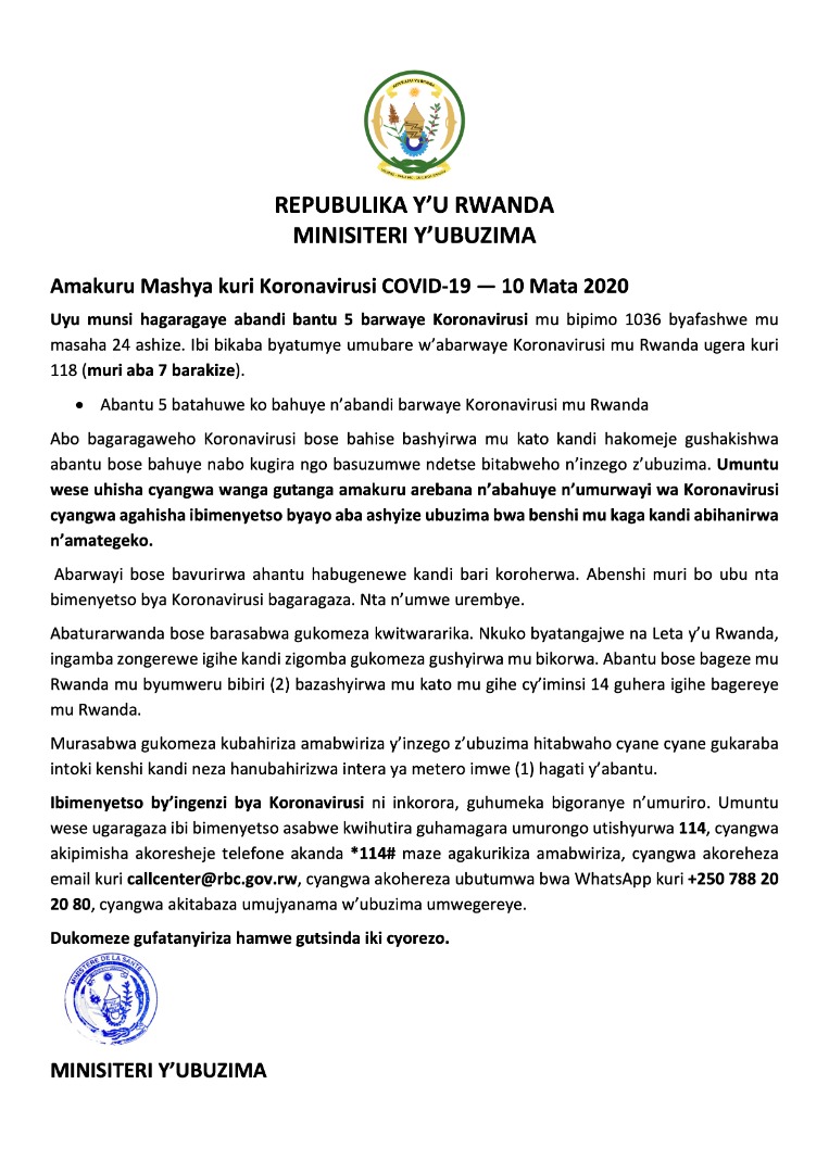 Abanduye coronavirus mu Rwanda bageze ku 118, nyuma y’uko kuri uyu wa 10 Mata 2020, Minisiteri y’Ubuzima yapimye abantu 1036 ibakekaho coronavirus, igasangamo batanu bayirwaye.
