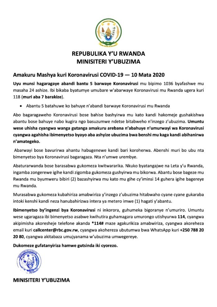 Kugeza ubu iyi minisiteri ivuga ko abamaze gukira ari barindwi, mu gihe nta n’umwe urahitanwa n’iyi virus mu Rwanda nk’uko ibitangaza.