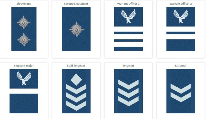 Amapeti y’abasirikare bo mu mutwe w’ingabo zirwanira mu kirere aba afite ibirango nk’iby’abandi basirikare ariko amabara yo aba atandukanye kimwe n’uko imyambaro yabo iba yihariye. Umugabo w’Ingabo rirwanira mu kirere ni Major General Charles Karamba.