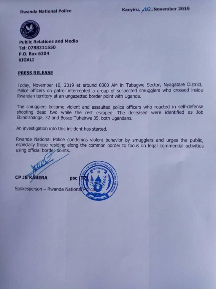 Polisi y’u Rwanda iratangaza ko mu rukerera rwo kuri iki cyumweru tariki ya 10 Ugushyingo 2019, yarashe abantu babiri bageragezaga kwinjiza magendu mu Rwanda banyuze ku mupaka utemewe mu murenge wa Tabagwe mu karere ka Nyagatare.
