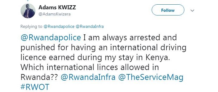 Kwizera Adams yandikiye polisi y’ u Rwanda kuri Twitter ayibaza ubwoko bw’ uruhushya rwo gutwara ibinyabizaga rutangirwa hanze rugira agaciro mu Rwanda kuko we ngo afite urwatangiwe muri Kenya kandi nyamara ahanwa nk’ udafite uruhushya rwemewe rwo gutwara ibinyabiziga mu Rwanda.