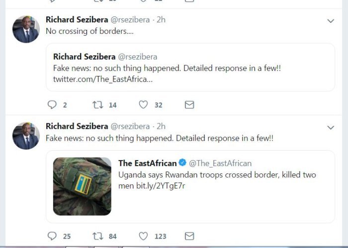 Umuvugizi wa Guverinoma y’ u Rwanda akaba na Minisitiri w’ Ububanyi n’ amahanga Dr Richard Sezibera yatangaje ko amakuru y’ uko ingabo z’ u Rwanda zarasiye ku butaka bwa Uganda abantu babiri ari igihuha.