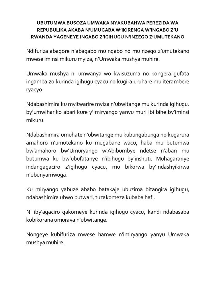 Muri ubu butumwa, Umukuru w’u Rwanda akaba n’Umugaba w’Ikirenga wa RDF, atangira agira ati “Ndifuriza abagore n’abagabo mu ngabo no mu nzego z’umutekano mwese iminsi mikuru myiza, n’Umwaka mushya muhire.”