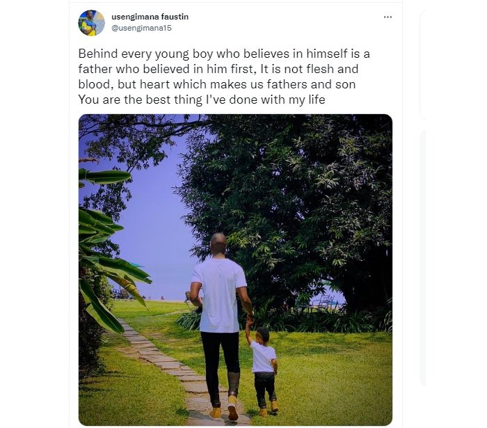 Amagambo aherekeje iyi foto ya Faustin Usengimana uba wambaye kimwe n’umwana we, yagize ati “Buri mwana w’umuhungu wese haba hari umuntu umushyigikiye kandi umwezera, uwo ni se ubanza kumwizera.”