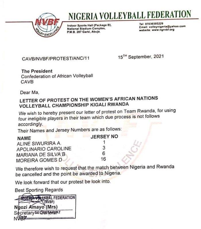 Iyi baruwa y’ikirego igira ati “Tukaba twasabaga ko umukino wahuje Nigeria n’u Rwanda wateshwa agaciro ubundi amanota agahabwa Nigeria.”