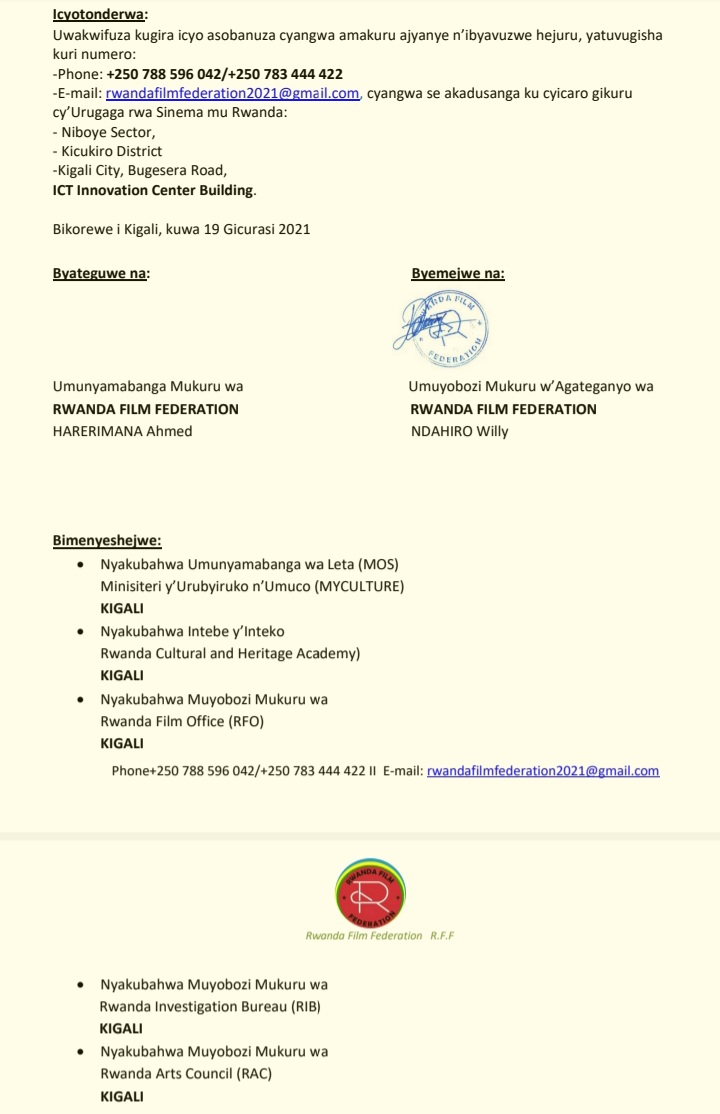 Iri tangazo ryashyizweho umukono n’Umuyobozi w’agateganyo w’Urugaga rwa Sinema mu Rwanda (RFF/Rwanda Film Federation) Willy Ndahiro, rivuga ko umuntu wese ushaka kugira igikorwa cya sinema akora, agomba kubanza kwegera uru rugaga kugira ngo ahabwe ubufasha bw’ibanze bumuhesha uburenganzira bwo kuba yafashwa n’izindi nzego za Leta.