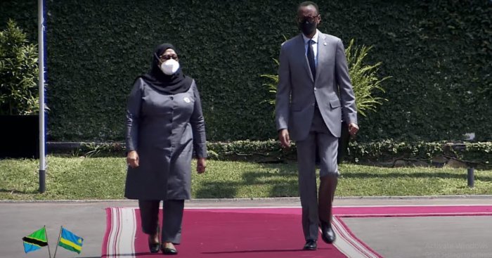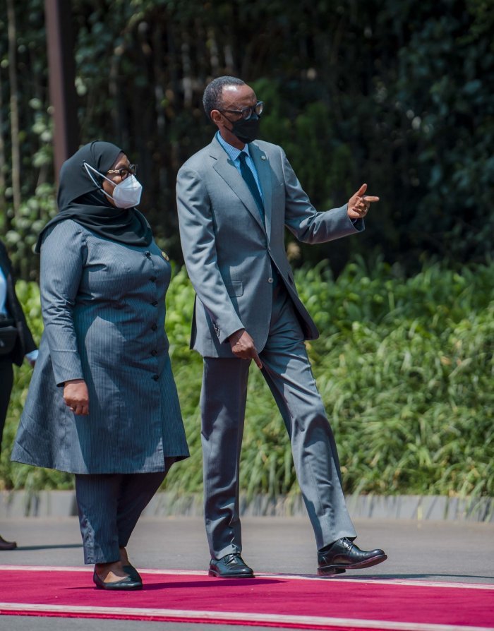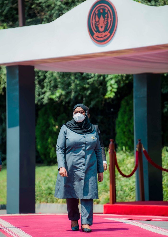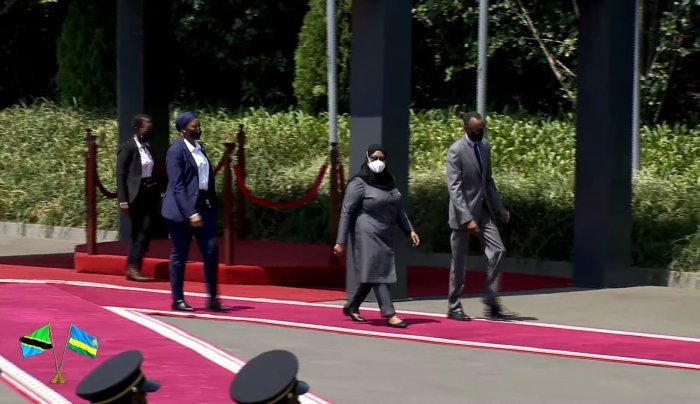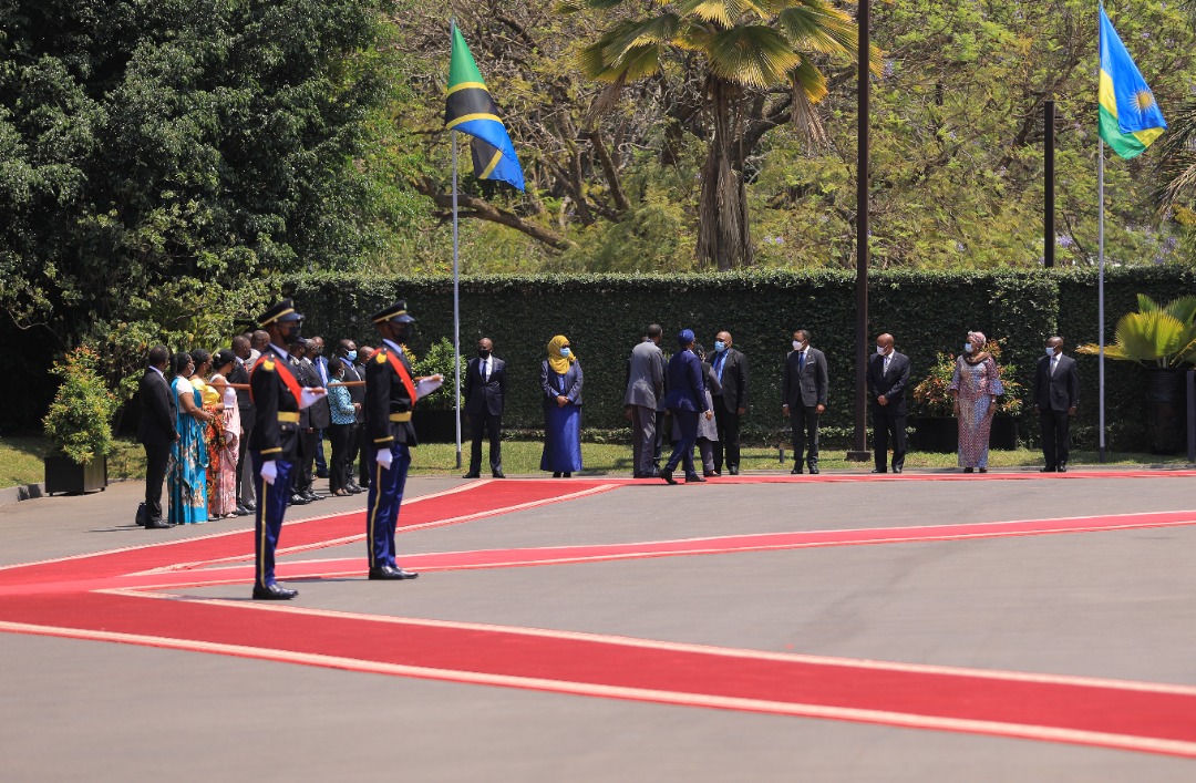 Ubwo indirimbo zubahiriza ibihugu byombi zari zimaze kuririmbwa, Perezida Madamu Samia Suluhu Hassan yabanje kunyura mu karasisi ubwo yarebaga impagarike y’umutwe w’ingabo z’u Rwanda zakira abayobozi bakomeye.