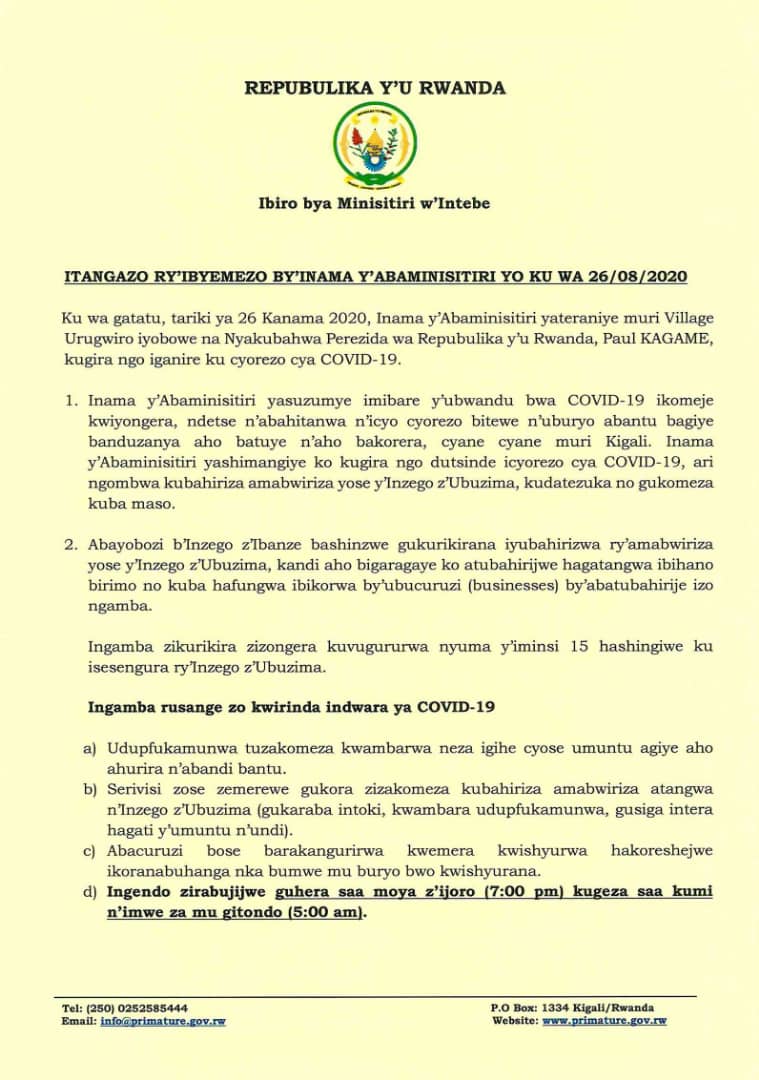 Nk’uko bigaragara mu byemezo by’Inama y’Abaminisitiri yateranye kuri uyu wa Gatatu, ingendo hagati y’Umujyi wa Kigali n’Intara mu modoka zitwara abagenzi mu buryo bwa rusange zahagaritswe hanafatwa izindi ngamba zo kwirinda zirimo kuba amasaha yo kuba abantu bari hanze y’ingo zabo yigijwe imbere, abantu bakazajya baba bari mu ngo kuva saa moya z’umugoroba kugeza saa kumi n’imwe za mugitondo.