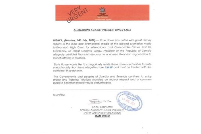 Itangazo ryaturutse muri Peresidanse ya Zambia kuri uyu wa 14 Nyakanga 2020, rivuga ko ibyo Sankara yavugiye mu rubanza ruri kuburanishwa n’urukiko rukuru ruburanisha ibyaha mpuzamahanga n’ibyaha byambukiranya imipaka ari ibinyoma.