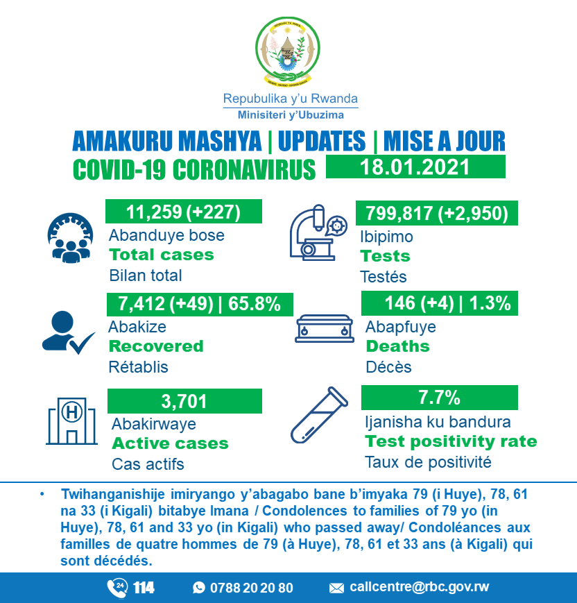 Icyorezo cya COVID-19 gikomeje gukaza umurego mu Rwanda kuko kuri uyu wa 18 Mutarama 2021 cyahitanye abantu bane barimo uw’imyaka 33 mu gihe abanduye bashya ari 227.