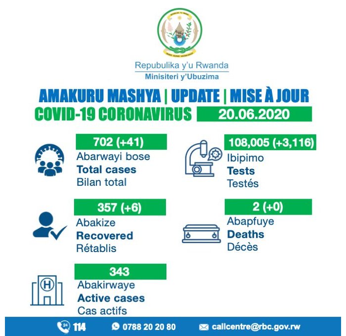 Imibare ya Minisiteri y’Ubuzima mu Rwanda igaragaza ko kuri uyu wa Gatandatu tariki 20 Kamena 2020 mu Rwanda habonetse abarwayi bashya mirongo ine n’umwe (41) ba COVID-19.