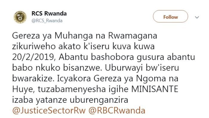Urwego rw’ Igihugu rushinzwe Imfungwa n’ Abagororwa RCS rwatangaje ko Gereza ya Muhanga n’ iya Rwamagana zakuriweho akato k’iseru.
