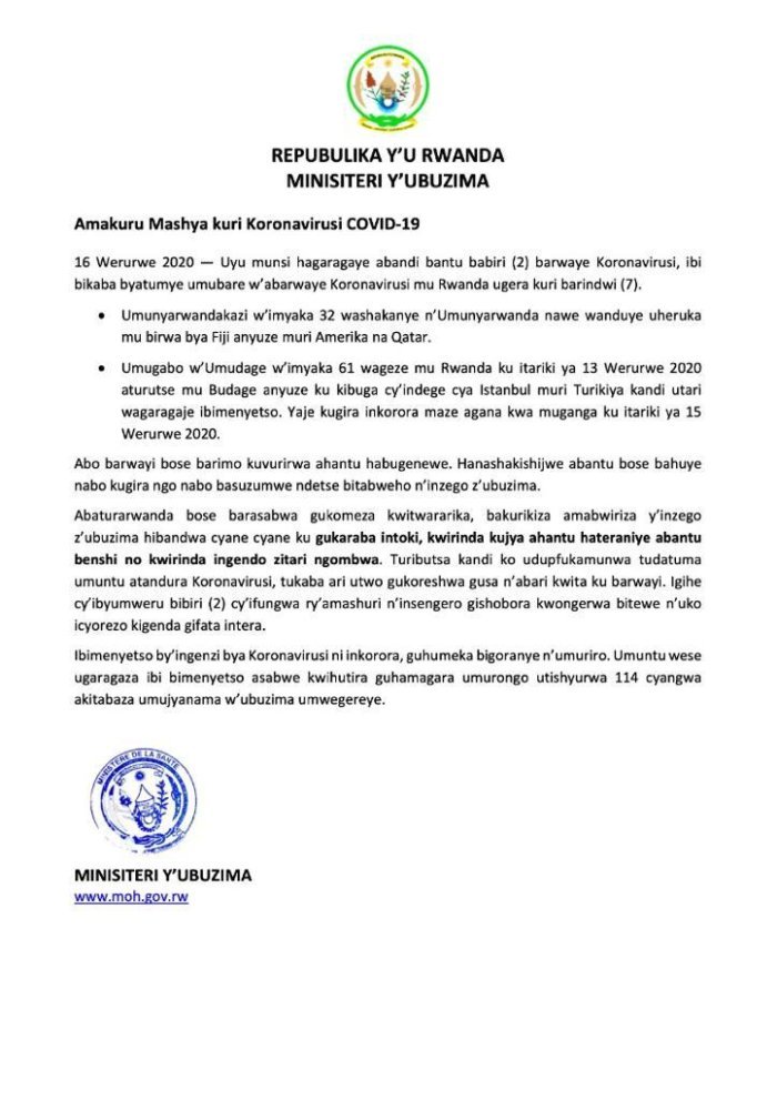 Minisiteri y’ ubuzima mu Rwanda yatangaje ko kuri uyu wa 16 Werurwe 2020, hagaragaye abandi bantu babiri banduye coronavirus, bivuze ko abamaze kumenyekana ko bayifite mu Rwanda ari 7.