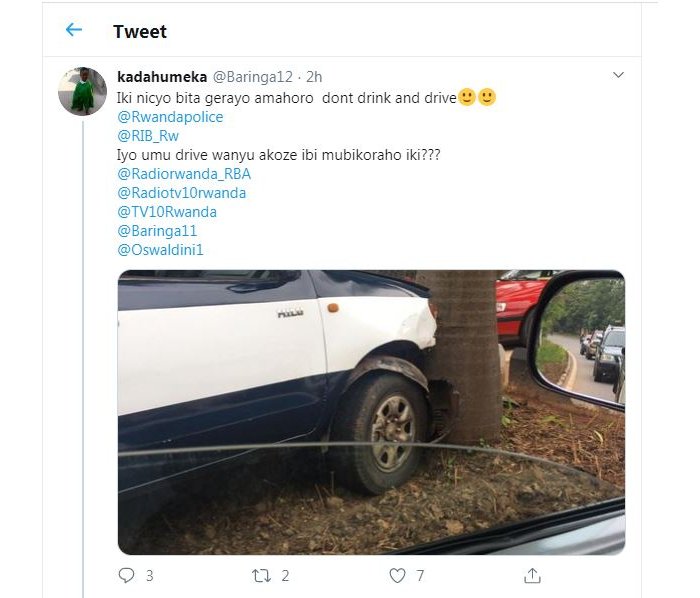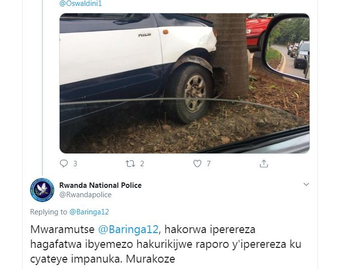 Polisi y’ u Rwanda nayo ibinyujije kuri twitter yahize imusubiza iti “ Mwaramutse Baringa12, hakorwa iperereza hagafatwa ibyemezo hakurikijwe raporo y’iperereza ku cyateye impanuka. Murakoze”.