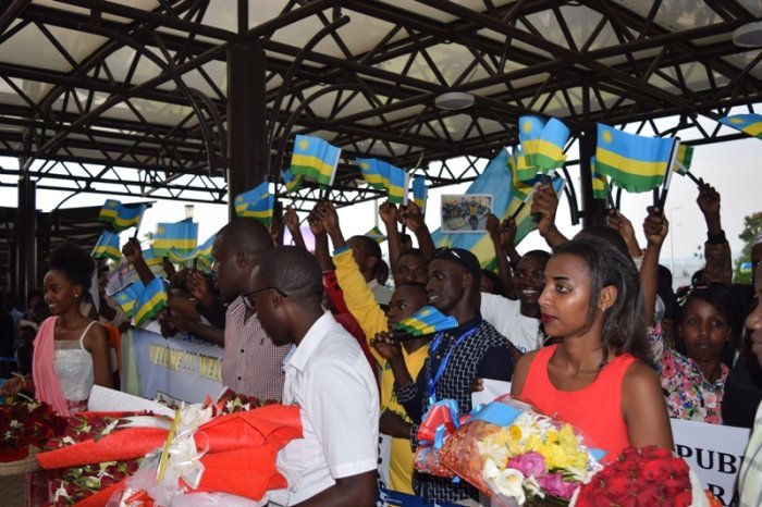 Areruya na bagenzi be bakigera ku kibuga cy’indege i Kanombe batunguwe no kubona imbaga y’abantu mu ngeri zitandukanye bagiye kubakira babereka ko bakozwe ku mutima n’intsinzi bakuye muri Gabon ahaberaga iri rushanwa.