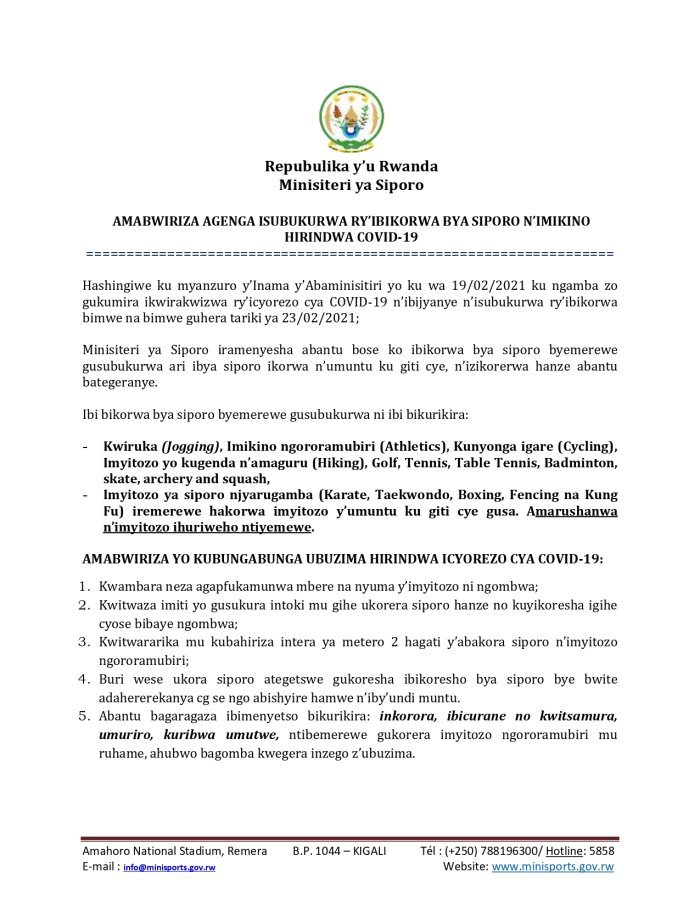 Ni amabwiriza yasohotse kuri iki cyumweru aje akurikira ibyemezo by’inama y’Abaminisitiri yateranye ku wa Gatanu tariki 19 Gashyantare 2021 ikemeza ko ibikorwa bya siporo ikorwa n’umuntu ku giti cye n’izikorerwa hanze abantu bategeranye.