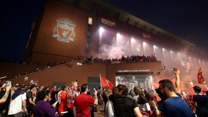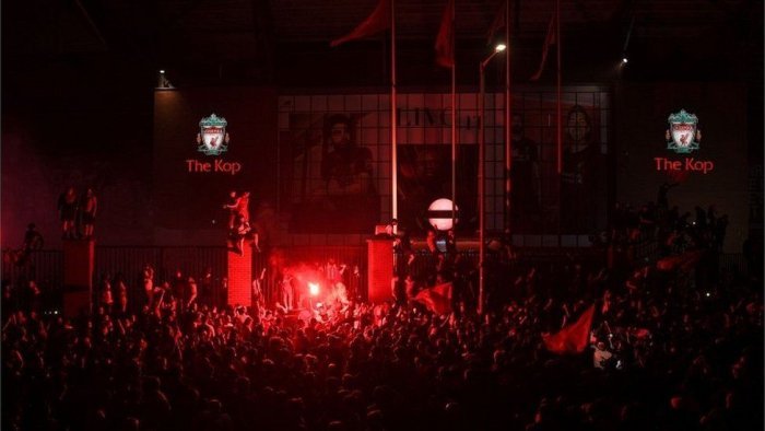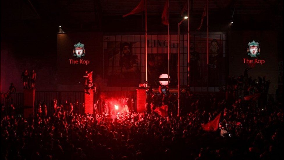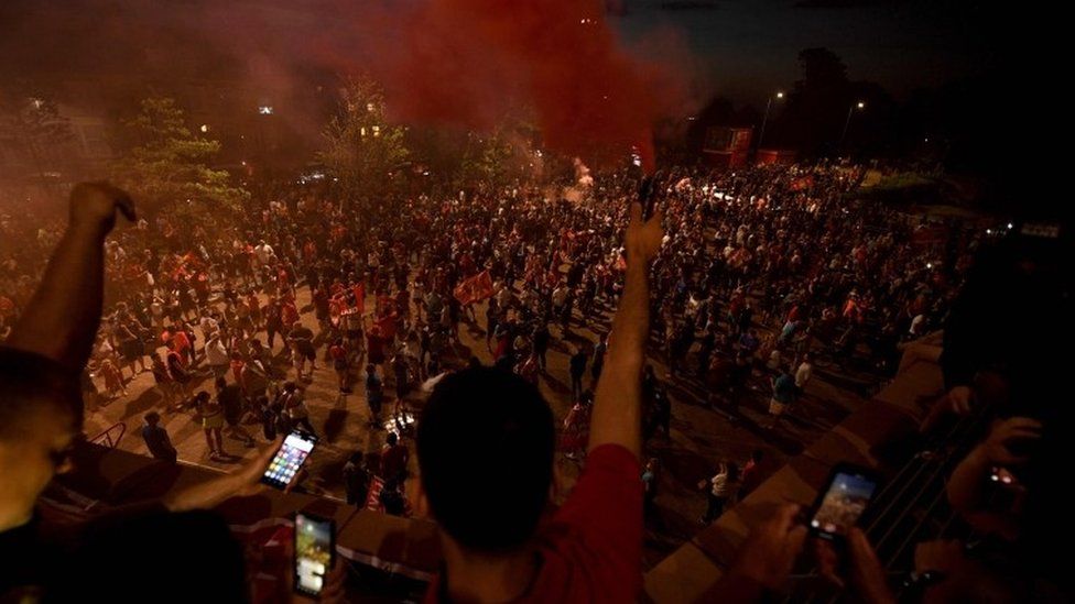 Abafana b’Ikipe ya Liverpool FC baraye mu mihanda bishimira igikombe cya igikombe cya Shampiyona y’Umupira w’Amaguru mu Bwongereza, Premier League, ikipe yabo yegukanye nyuma y’imyaka 30 yari ishize itagikozaho imitwe y’intoki.