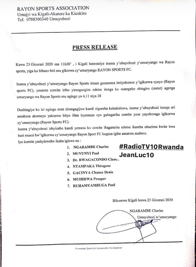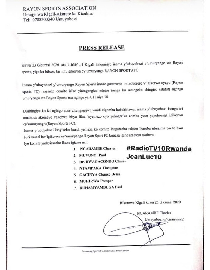 Itangazo rigira riti “Ku wa 23 Gicurasi 2020 saa 11h30, i Kigali hateraniye inama y’ubuyobozi y’umuryango wa Rayon Sports, yiga ku bibazo biri mu gikorwa cy’umuryango Rayon Sports FC.”
